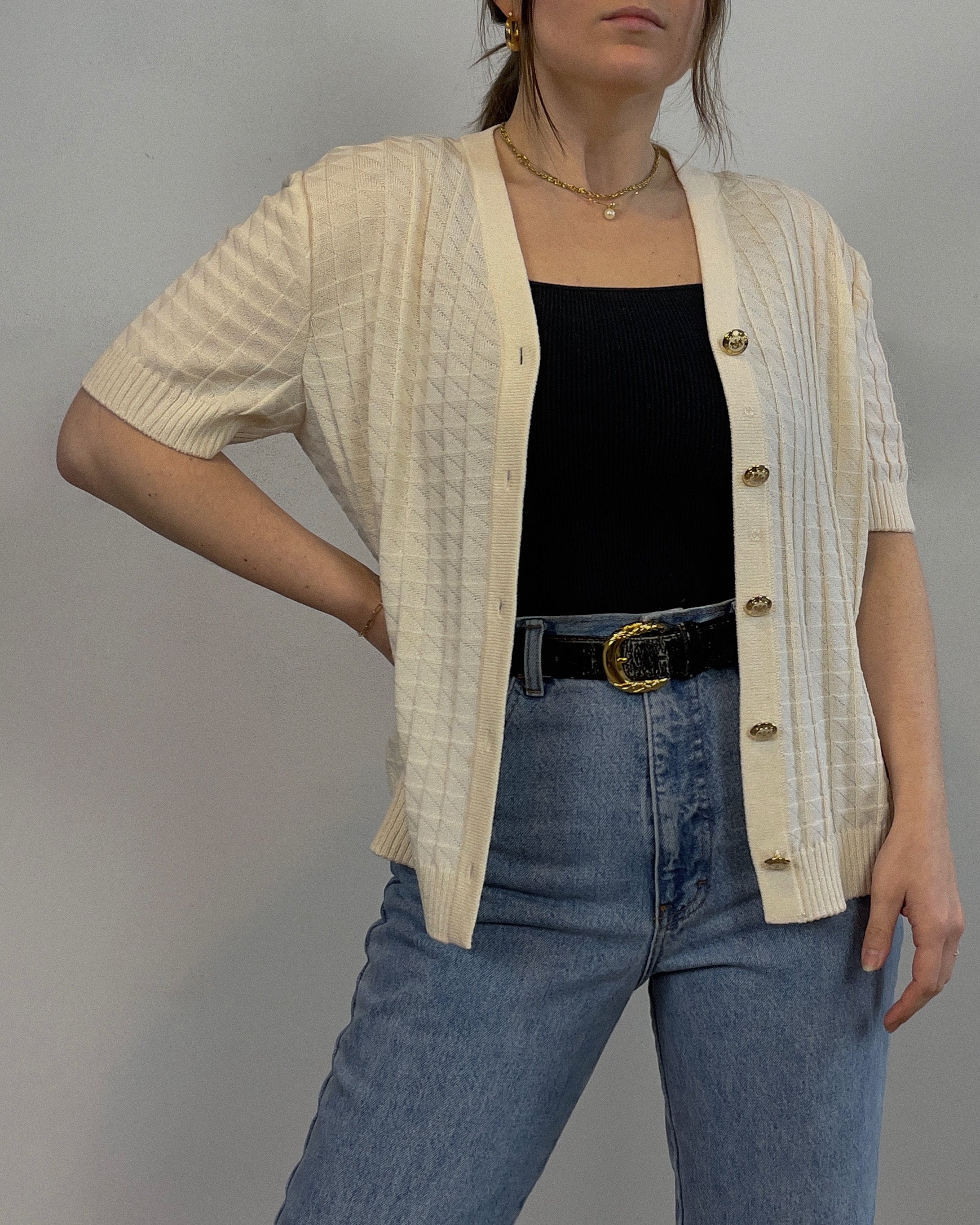 Triangle textured knit cardigan with gold accent buttons.