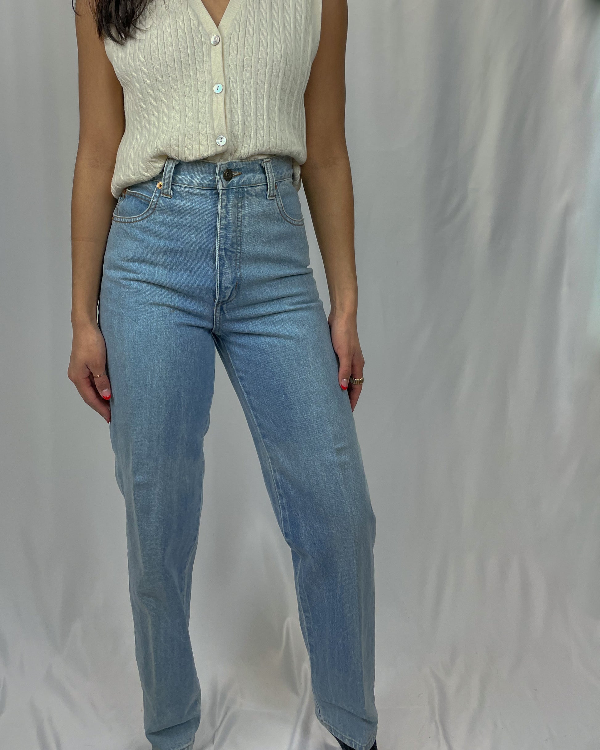 Amazing vintage faded light blue denim with intricate patch. These staple jeans offer 5 pockets, a high rise zipper closure, and belt loops. We envision this piece being dressed up for a night out, or worn casually with a blouse and sneakers.